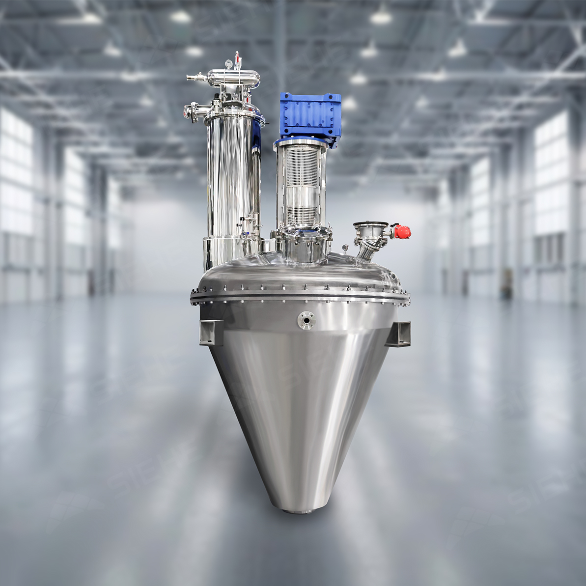The customized dryer integrates mixing, reaction, and drying functions to significantly enhance process efficiency. The dryer is equipped with heating jacket, and its main shaft and ribbon can be also with heating function to improve drying efficiency furthermore. Its specially designed ribbon agitator ensures complete material turnover while maintaining minimal clearance with the vessel wall, effectively preventing material adhesion.The main shaft incorporates mechanical seals to ensure high-vacuum containment, enabling highly efficient drying when connected to the vacuum system, with drying efficiency 3-5 times higher than conventional equipment. To minimize material loss, the dryer is fitted with a top-mounted dust collector featuring a reverse-purging device that introduces nitrogen gas to block and redirect entrained particles. The whole system can be designed with PLC intelligent control ,and with signal interface to realize remote control.